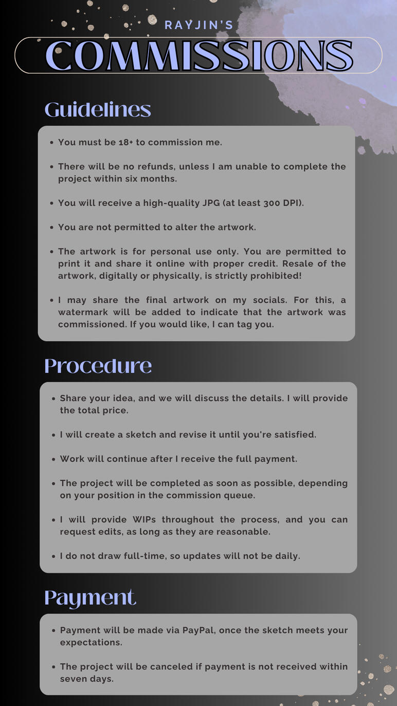 If you're interested in commissioning me, please write me a dm on social media, discord or a mail!If you like something drawn which doesn't fit to the previews on the right, don't be shy to ask! I'm pretty sure anything will be possible and those are just examples :)